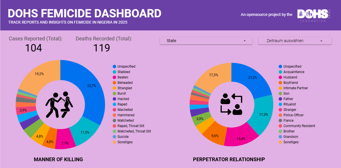 DOHS tracked 150 cases in 2024 and 88 in the first half of 2025. On average one women is killed every 49 hours or every second day. In 23,5% of all cases, the method of killing is unspecified. 11,8% of the women and girls got killed, and 11% stabbed to death.